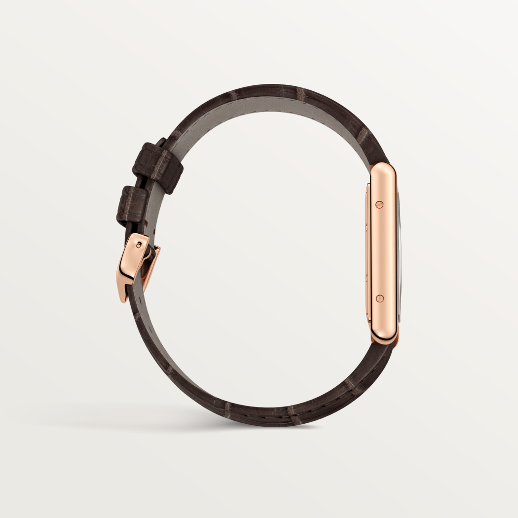 タンク ルイ カルティエ ウォッチ、SM、クォーツムーブメント。 イエローゴールド750/1000製ケース、パール状の飾り付きリューズにサファイア カボション、シルバーグレイン仕上げダイアル、ブルースティール製剣型針、ミネラル クリスタル、アリゲーター ストラップ、 イエローゴールド750/1000製アルディロン バックル。ケースサイズ:29.5mm x 22mm、厚さ:6.35mm。日常生活防水。